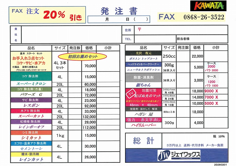 ジェイワックス商品 FAX注文のみ【特別価格:20%引き】